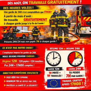 Un sapeur-pompier en garde de 24 heures est présent, disponible et mobilisable 24h/24.Pourtant, ces 24 heures ne sont pas reconnues comme 24 heures de travail effectif. – Une garde de 24h n’est comptabilisée que 17h08...